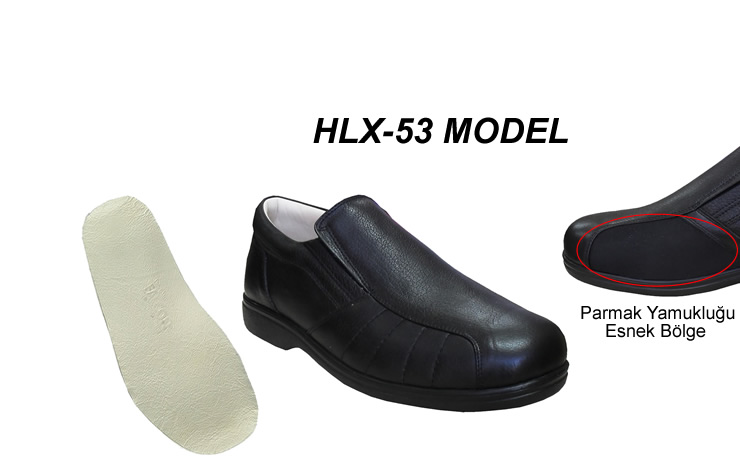 Ayak kemiği çıkıntısı için ayakkabı HLX-53 modeli hakiki deri, ortopedik ve parmak yamukluğu için üretilmiş ayakkabı modelidir. Bunyon ağrıları olan erkeklerin ayaklarında yaşadığı sürtünme sonrasında yaşanılan acıyı en az seviyeye indirgeyen ve daha sağlıklı bir yürüyüş deneyimini sağlayan özel ayakkabılardır.