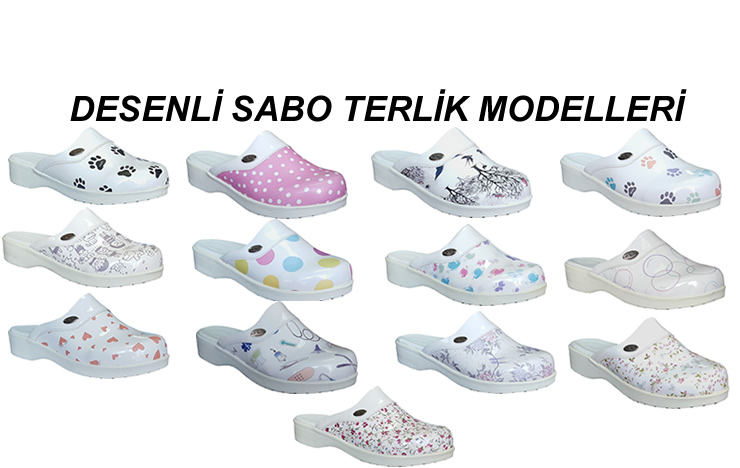 Bayan desenli sabo terlik modelleri özel baskı teknikleri ile sayanın üzerine renkli baskı yapılmış ve piyasadaki desenli sabo terlik modellerinin aksine kolayca silinmeyen ve görsellerin çıkmadığı özel teknik ile üretilmiştir. 2017 yılı itibarı ile bayan desenli sabo terlik ürünleri 14 farklı desen çeşidine ulaşmış hastane, otel, mutfak ve temizlik bayan çalışanları tarafından tavsiye ve talep oranı yüksek ürünlerdir.