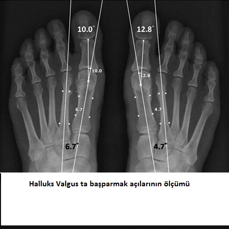 Bir başka Halluks Valgus şiddetini derecelendirme yöntemi intermetatarsal açı (IMA)’dır. Ölçüt birinci ve ikinci metatarsal kemiklerin uzunlamasına eksenleri arasındaki açıdır ve bu normalde 9 dereceden küçüktür. Metatarslar, ayak parmakları ve ayak bileği arasındaki ayak tarak kemikleridir.